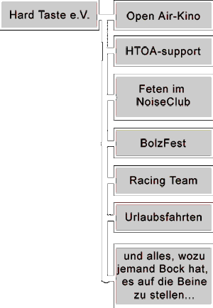 Tyrannchen hat natürlich Recht, wenn er schreibt, dass das da unten kein Vereinsorganigramm ist. So hab ich das auch nicht aufgefasst. Es zeigt lediglich, dass neben dem Mainevent noch andere Events laufen sollen, die das HTOA in seiner Struktur festigen. Es war ja bislang auch immer so, dass sich ein Großteil der Crew zum Hard Taste gesehen hat und dann war wieder ein halbes Jahr Funkstille. Auf diese Weise bekommst du die Leute auch näher zusammen, was auch im Interesse von Zono liegt, denn dann kommen Kritik und Vorschläge/ Diskussionen nicht erst dann auf, wenn es brennt, sondern verteilt aufs Jahr, wo man auch besser reagieren kann. Ja bitte. Mach doch mal ein Vereinsorganigramm! DENN: wir meinen es ernst. Mit der Aufteilung des Vorstandes bin ich so aber nicht einverstanden, da gibt es auch andere Konstellationen. Alte Leute unter die Erde bringen lässt du mal schön bleiben, denn du gehörst ja im Grunde auch schon dazu und das wär ja dann mein Job - dich unter die Erde zu bringen. Und Mirko hat vollkommen Recht: Es scharen sich eine Menge Leute, um das HTOA, und genau die sollten nicht nur zum Festival aktiv sein/ aktiviert werden, sondern über das ganze Jahr. Es werden sich auf alle Fälle Verantwortliche für Zahlen und Papierkram finden. Ah ja... und den HTOA e.V. als Veranstalter für das Hard Taste selbst finde ich auch überdenkenswert (Daumen hoch, Mirko) ~~> schaut euch mal das DRAGENSDORF ROCKT an, da steht der Verein Music Works e.V. als Veranstalter dahinter. Und die haben ja dieses Jahr auch saugeile Bands im Line Up... wer ist Götz Widmann? SALTATIO MORTIS und Ingrimm... Da sieht man auch, was man aus Fördergeldern machen kann. Jups, genauso wie das BeFit. |